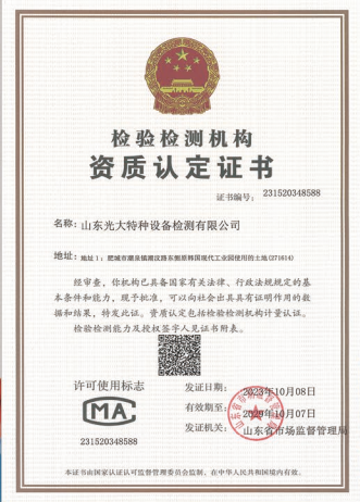 山東光大特種設(shè)備檢測有限公司是經(jīng)山東省市場監(jiān)督管理局核準(zhǔn)的甲類B1特種設(shè)備綜合檢驗(yàn)機(jī)構(gòu)。2017年9月30日取得了山東省市場監(jiān)督管理局頒發(fā)的《檢驗(yàn)檢測機(jī)構(gòu)資質(zhì)認(rèn)定證書》。2018年2月22日取得了山東省市場監(jiān)督管理局頒發(fā)的《特種設(shè)備檢驗(yàn)檢測機(jī)構(gòu)核準(zhǔn)證》(起重機(jī)械)檢驗(yàn)檢測資質(zhì)。2021年11月取得山東省市場監(jiān)督管理局版發(fā)的《特種設(shè)備檢驗(yàn)檢測機(jī)構(gòu)核準(zhǔn)證》(安全閥在線、離線)校驗(yàn)資質(zhì)。2023年11月取得山東省市場監(jiān)督管理局頒發(fā)的甲類檢驗(yàn)機(jī)構(gòu)B1《特種設(shè)備檢驗(yàn)檢測機(jī)構(gòu)核準(zhǔn)證》,具有壓力容器(RD2...